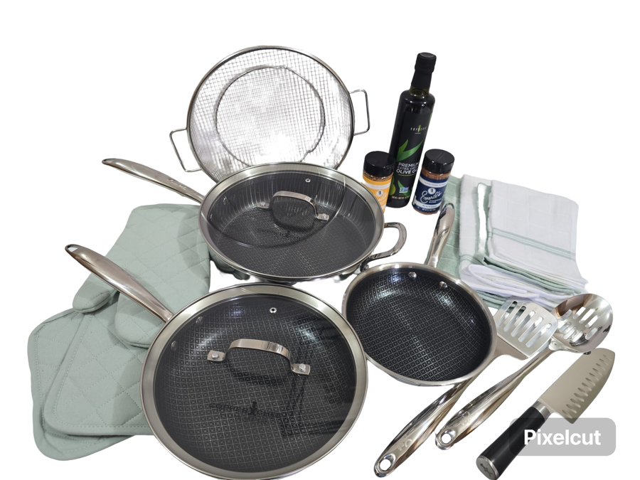 Introducing the Copper Chef Titen Pans, the ultimate cookware set designed for culinary enthusiasts! This collection features durable stainless steel construction, ensuring long-lasting performance and even heat distribution. The nonstick surface makes cooking and cleanup a breeze, allowing you to create delicious meals effortlessly. The set includes a large medium pan that is perfect for a variety of dishes, alongside a small pan for those quick meals or side dishes. Each pan comes with a tempered glass lid, providing visibility while you cook and helping to retain moisture and flavor. Additionally, this comprehensive package includes a steam crisper basket that elevates your cooking game by allowing you to steam and crisp your food simultaneously. To equip you further, we've included a chef knife, spoon, and spatula to enhance your kitchen experience. Don't forget the essentials! This auction also comes with dish towels and oven mitts for your convenience and safety while cooking. Plus, a bottle of olive oil is included to kickstart your culinary adventures. Elevate your kitchen with the Copper Chef Titen Pans and enjoy the art of cooking like never before!