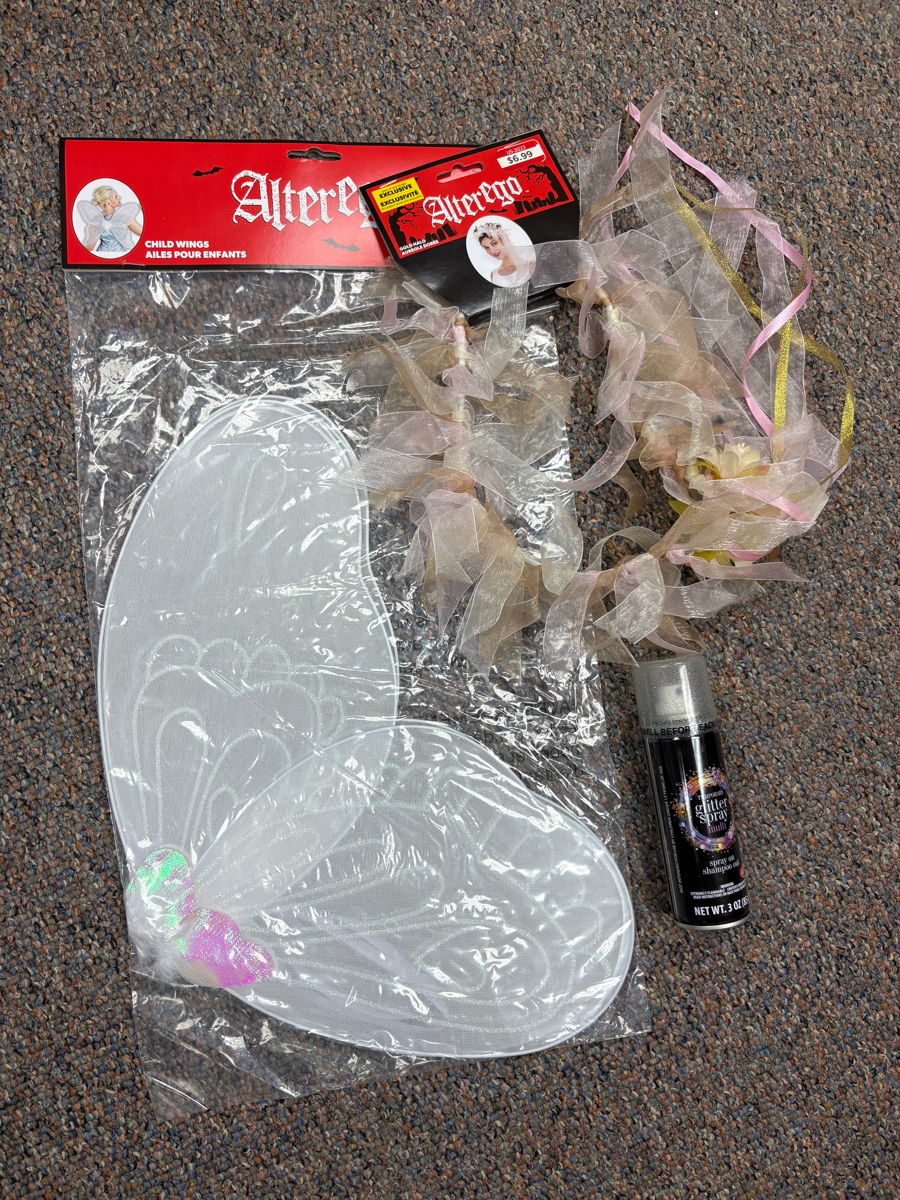 Includes white glitter wings, gold halo headband, and multicolor glitter hairspray. New