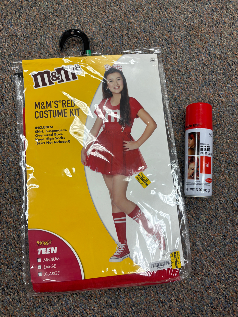 Includes shirt, suspenders, oversized bow, knee high socks (skirt not included), and red hairspray paint. Size Teen Large New