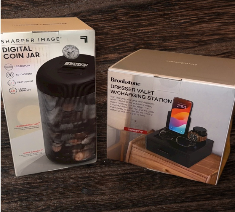 Organize your bedside dresser with this dresser valet charging station and digital coin counting jar.