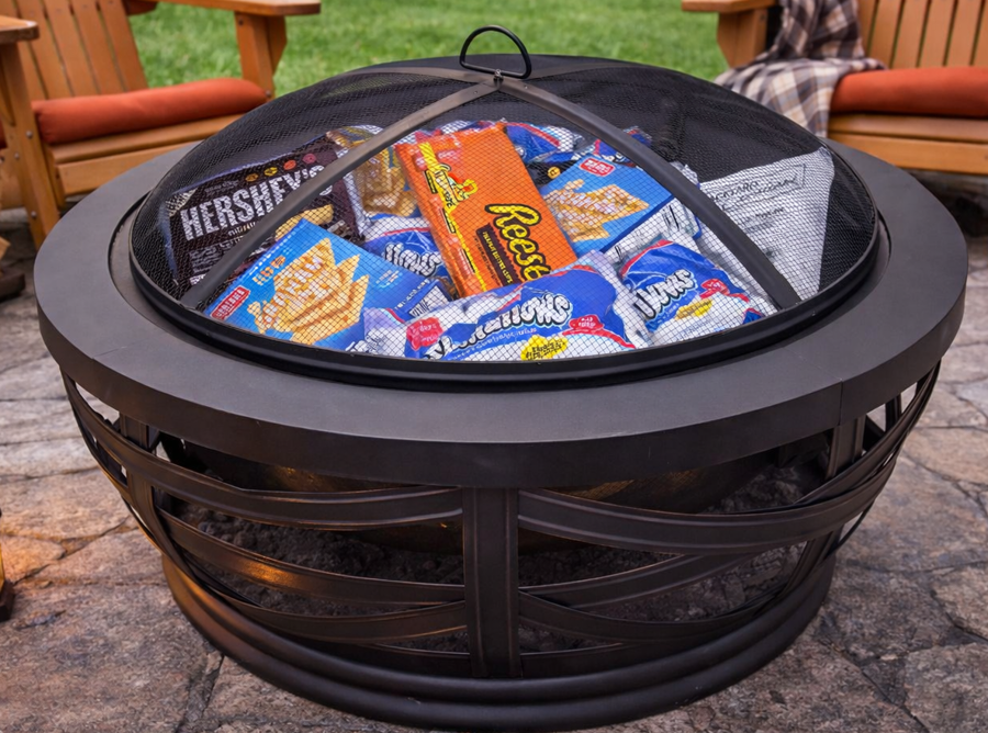This bundle includes a stylish fire pit with protective mesh lid plus everything you need for the perfect s’mores night — marshmallows, graham crackers, chocolate, and even Reese’s for an upgraded twist.