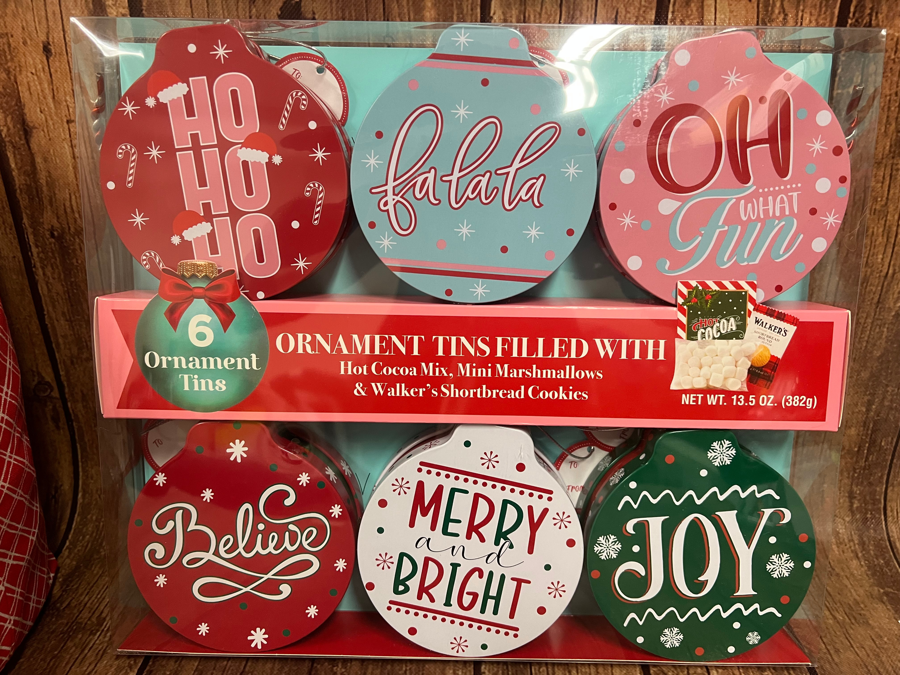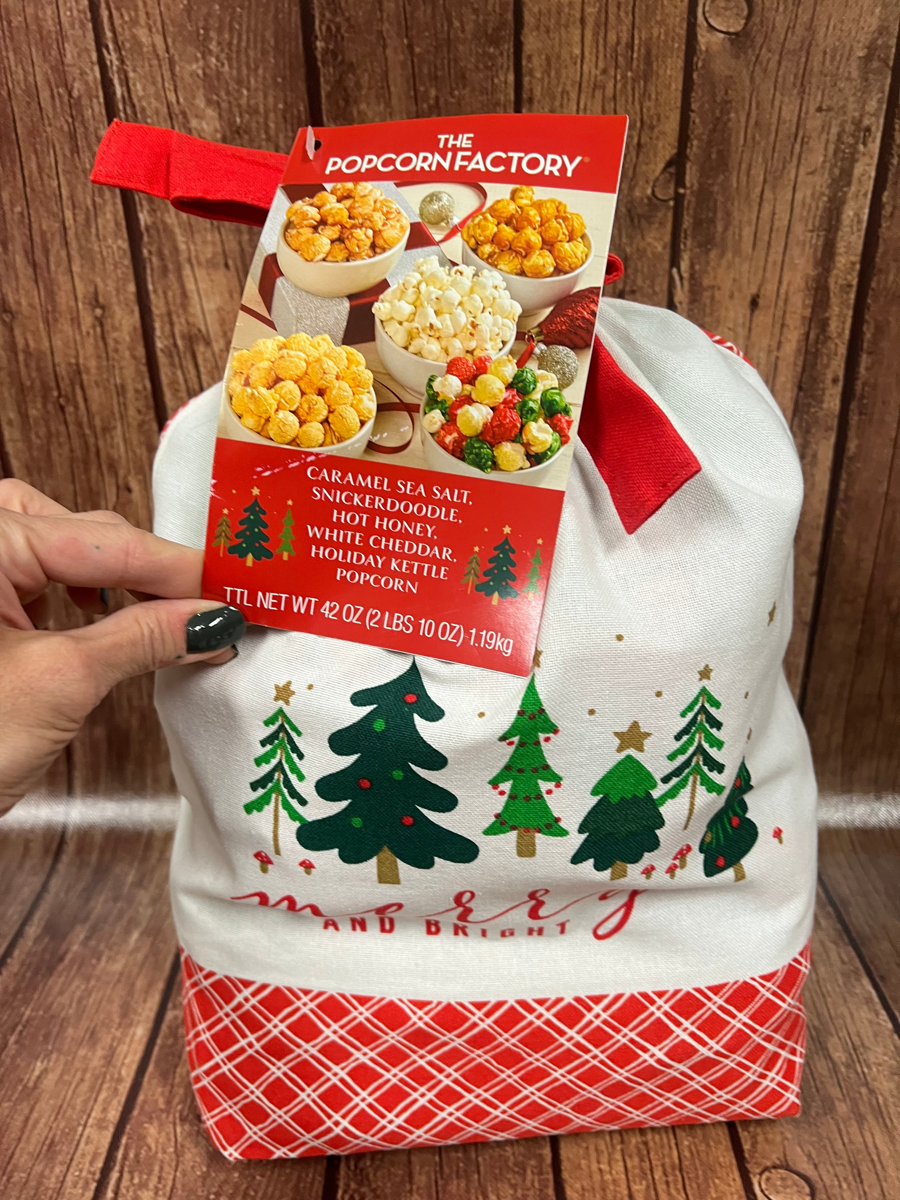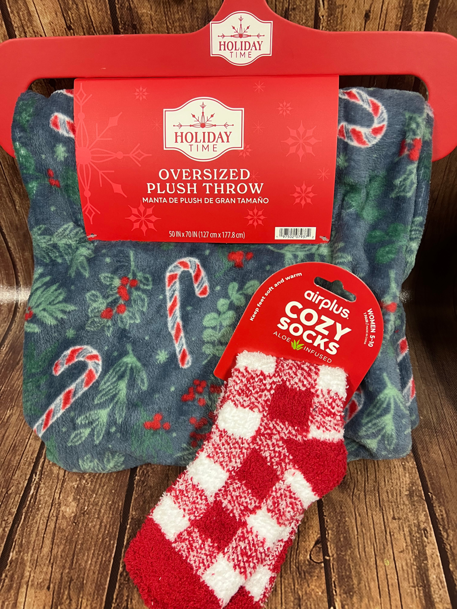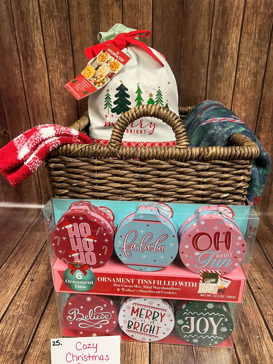 Large basket with: Popcorn factory- 42oz variety popcorn 50x70 Christmas throw and fuzzy socks 6 ornament tins with cocoa, and shortbread cookies