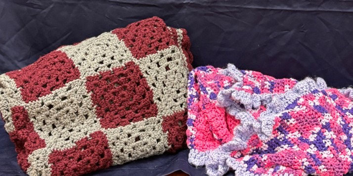 Cozy Handmade Crochet Blankets. One Handmade Red and Gray patchwork blanket, size 60”x60” and one Pink, Purple and White Blanket with ruffled edging, size 44”x 58”