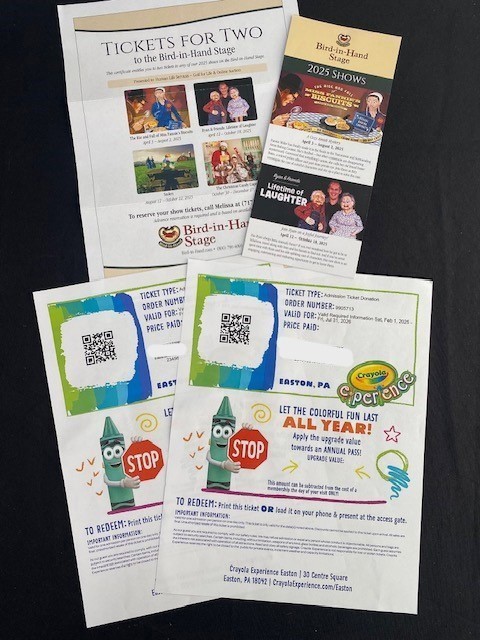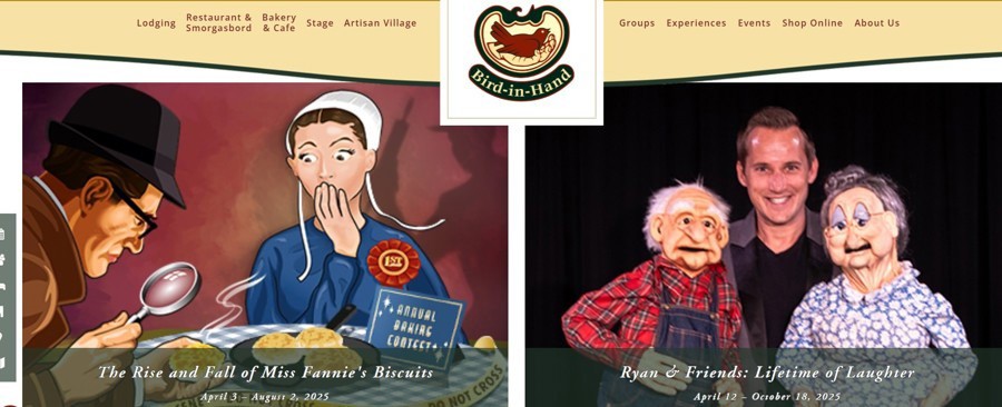 2 Tickets for Bird in Hand Theatre. Choose from 5 live Broadway-caliber musical experiences during the 2025 Season. Puppet, Who-Dun-It, and Christmas-themed shows available. Also on-site you can enjoy dining and lodging.