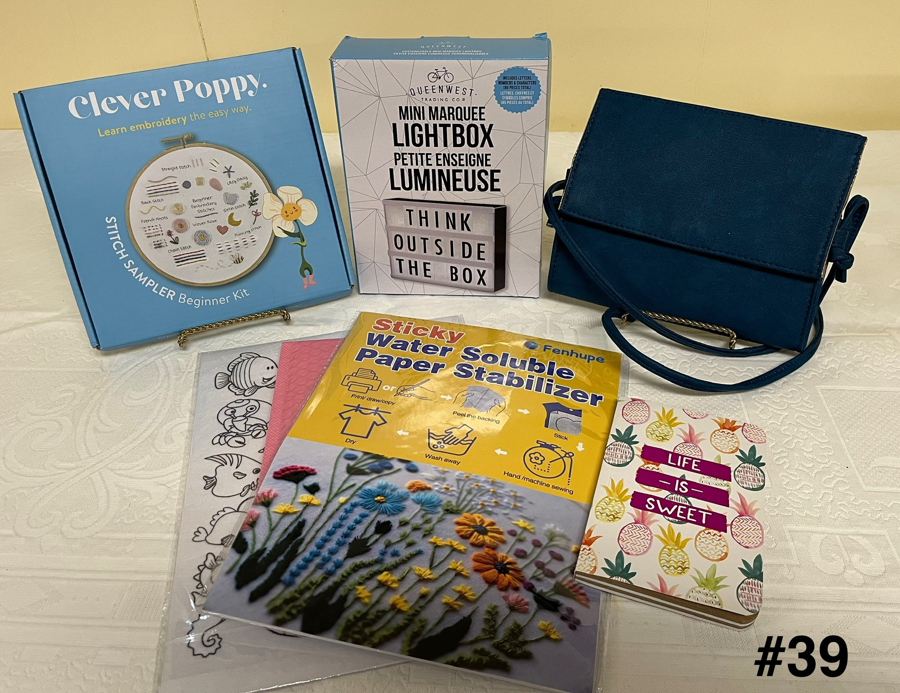 Clever Poppy embroidery kit, Water soluble paper, mini Marquee lightbox, handmade teal crossbody purse with gold interior and note book.