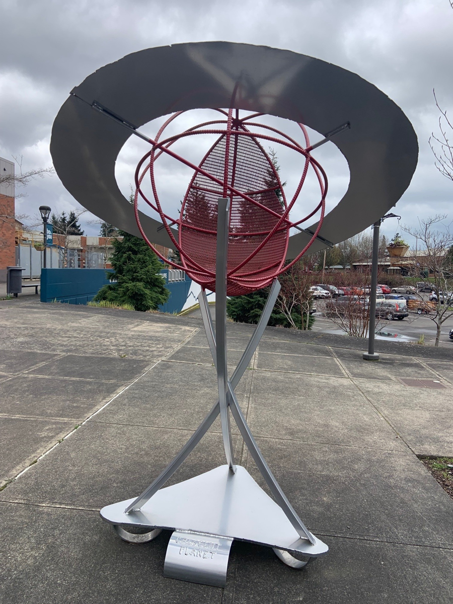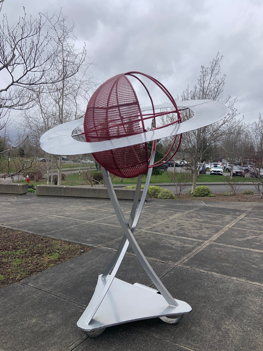 Standing about 8' tall, this piece has been powdercoated to withstand whatever the northwest weather can throw at it! The sculpture was created from scrap at the 2009 Welding Rodeo by the professional team from WoodStone, which included several BTC graduates. After enjoying it for many years, the original buyer generously donated it back to us to raise money for the Welding Program.