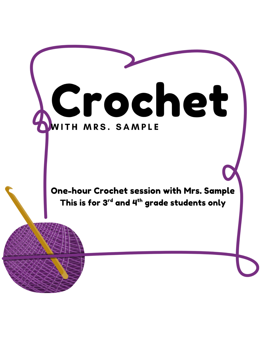 Calling all creative kids! A 3rd or 4th grade student will enjoy a special one-hour crochet session with Mrs. Sample, learning the basics and creating something fun with their own hands. Whether you’re brand new to crochet or already love crafting, this is a wonderful opportunity to relax, learn a new skill, and spend quality time with a favorite teacher.