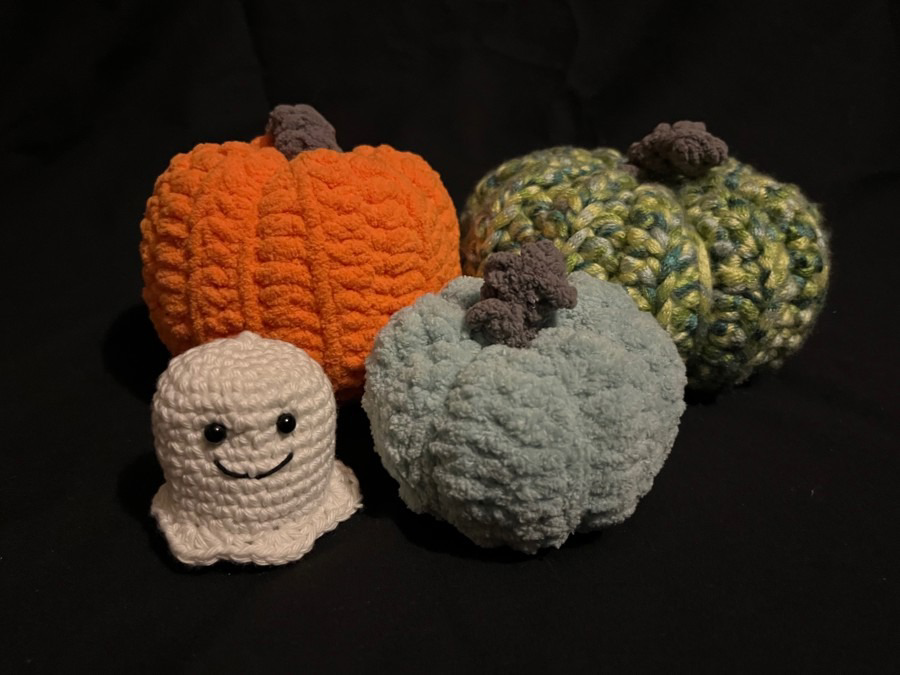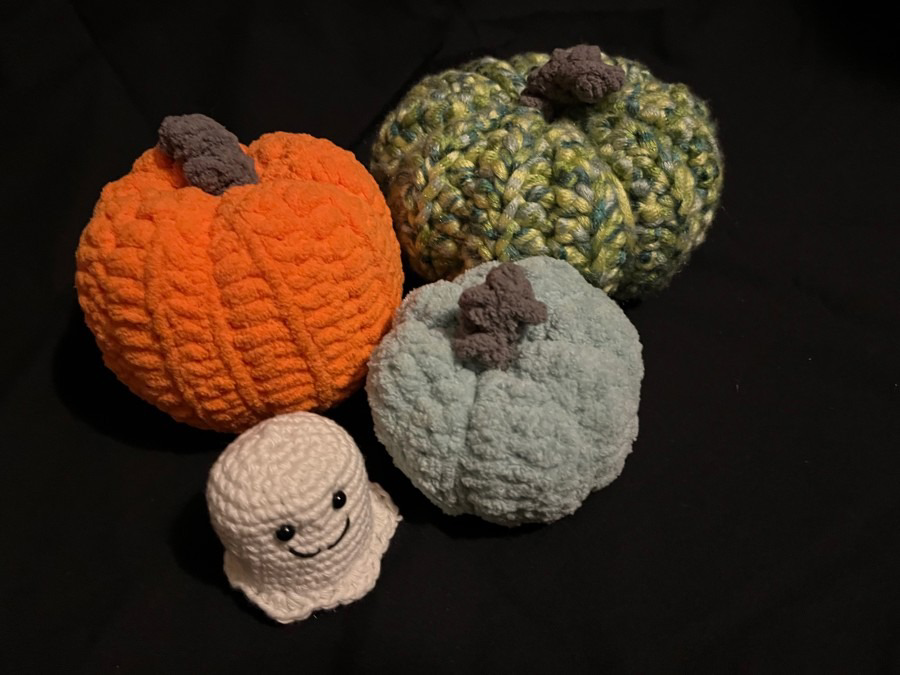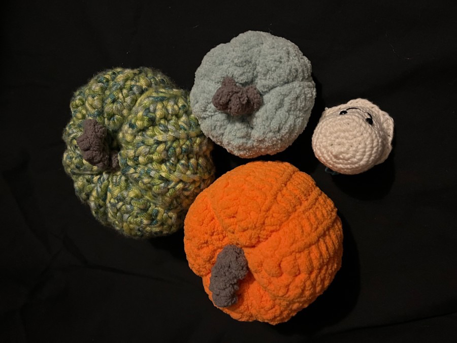 Enhance your fall decorations with these hand-crafted items! Three crochets pumpkins, all hand crafted by our very own Pre-K Teacher Mrs. Henderson (aka Ms. Tara) The largest pumpkin stands 4 inches tall by 6 inches wide and is made with Bernat colorwhirl 100% acrylic yarn in the color Hedgerow (which is green variegated). The medium pumpkin stands 4.5 inches tall by 4.5 inches wide and is made with Bernat blanket 100% polyester (chenille-style) yarn in a bright orange. The smaller pumpkin stands 3 inches tall by 4 inches wide and is made with Bernat blanket 100% polyester (chenille-style) yarn in a light teal green. Not recommended for children under 3