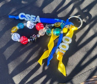 Keychain featuring "CSEA" and "100" in diamonds on blue and yellow ribbon; bead colors include blue, yellow, crystal and silver with dice charms.