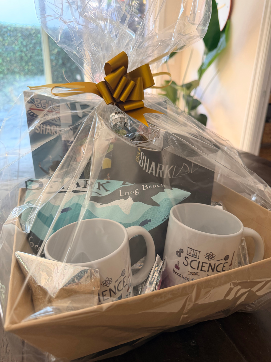Dive deep into the world of marine biology with this once-in-a-lifetime experience from the renowned CSULB Shark Lab! This exclusive package offers a rare, behind-the-scenes look at where cutting-edge shark research takes place. You'll get to see the tanks, learn about the research on local species (like the white sharks and leopard sharks you see off the Long Beach coast), and meet the scientists who are changing the way we understand these incredible predators. This incredible bundle is perfect for any shark enthusiast, marine biology student, or fan of the ocean's apex predators! This experience includes a gift basket with Shark Lab branded comic books, hat and t-shirt, plus two science themed mugs!