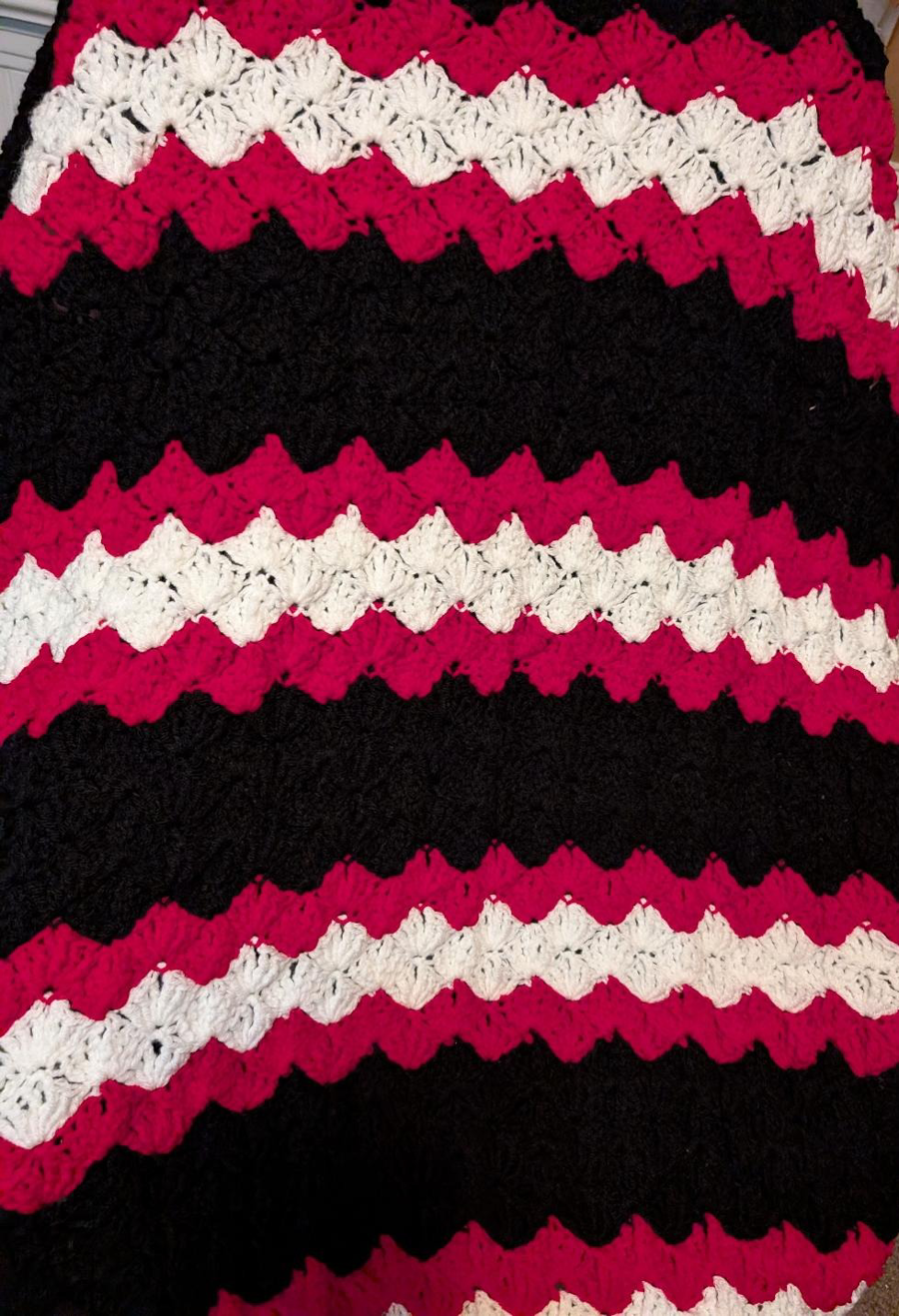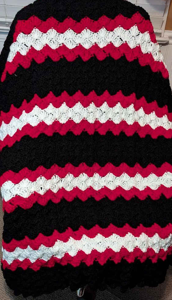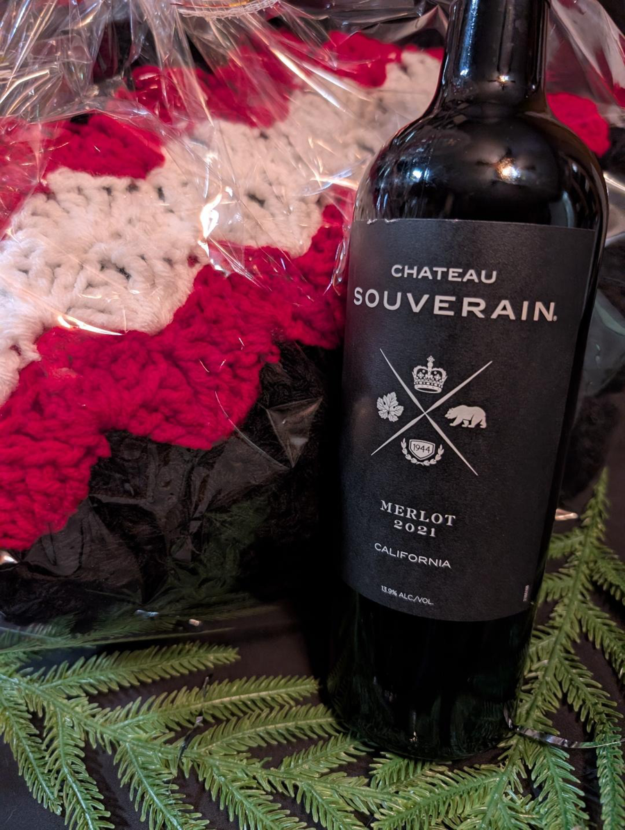 This includes a beautiful afghan-vibrant colors-red, black, and white. Beautiful afghan that will keep you warm on those cold Ohio winter nights, Also includes a bottle of Chateau Souverain-Merlot 2021. Happy Holidays, enjoy!
