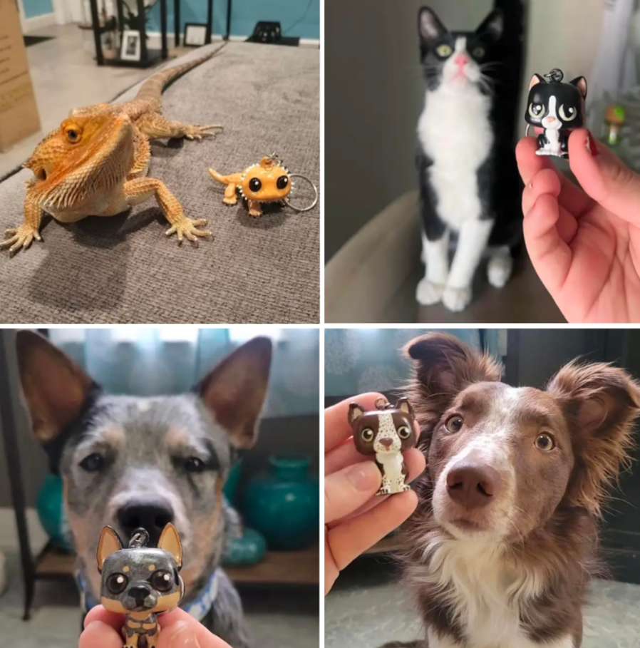 These one-of-a-kind keychains are the perfect pocket-sized keepsake for your keys, lovingly crafted to resemble your pet. Each piece is about 1½ inches tall, includes a keychain attachment, and is carefully hand-painted and sealed for protection. Karacel can create all breeds of cats and dogs, making them the perfect personalized gift for any pet lover. Check out more of her amazing work on Facebook: facebook.com/karacelscustoms Thank you, Karacel, for sharing your artistic talent and support!
