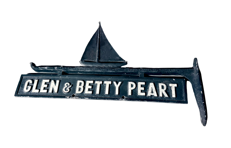 This custom iron sign has been hung at each of the Glen & Betty Peart homes including their final one in Muskoka. This sign has moved around from St.Catharines to Muskoka hung proudly for over 60 years! The sign is ready for a new spot in a collector's home! Approx.24x12"