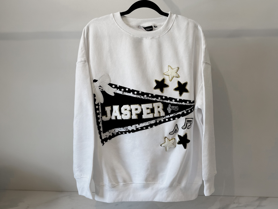 This handmade white crewneck sweatshirt (Size Medium) features a custom pennant-style appliqué with “Jasper” lettering across the front, blending classic school spirit with boutique-level detail. The design includes layered fabrics, raw-edge trim, embroidered musical accents, and metallic gold star appliqués for added texture and dimension.