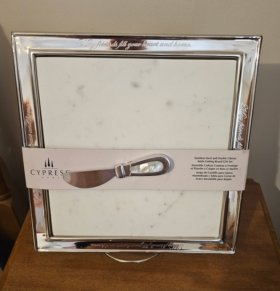 Stainless Steel and Marble Cheese Knife Cutting Board Gift Set. Saying on stainless steel part of cutting board reads "May Friends Fill your heart and home".