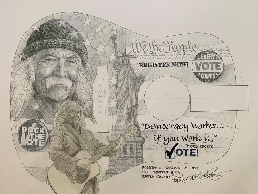 D-16E Rock the Vote. Framed and signed print on Martin guitar wood face. 21"w x 17"h Martin and artist Robert F. Goetzl have collaborated with David Crosby to produce a special-edition art guitar aimed at encouraging young people to actively participate in the nation’s election system. Key Features: A large painting of David Crosby on the body, encouraging people to "rock the vote and the stage all at once" US flag and Statue of Liberty graphics Quote from David Crosby: "democracy works, if you work it!" Model: Martin D-11E acoustic-electric guitar David Crosby was known to be devoted to Martin guitars, using them for over half a century