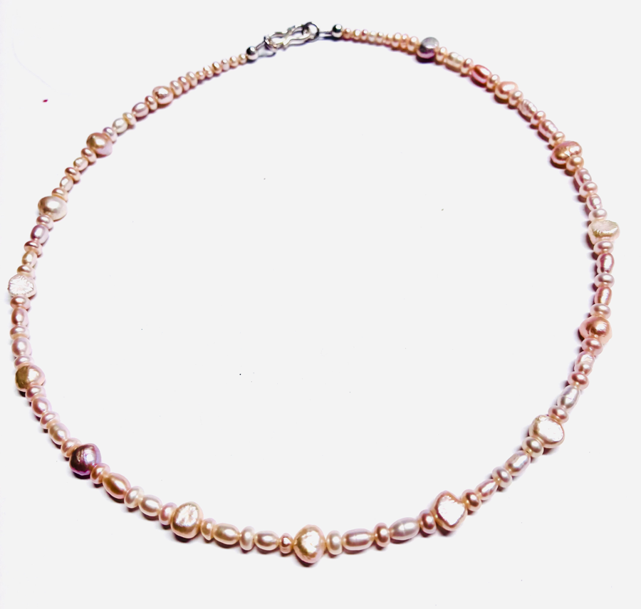 Dainty Pink Tone Fresh Water Pearl Choker Necklace w/ Sterling Silver S Clasp 18."