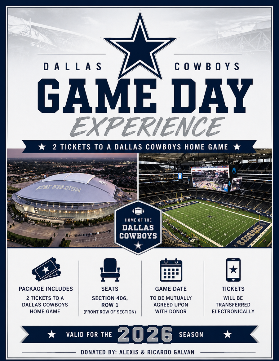 This package includes 2 tickets to a Dallas Cowboys home game (date to be mutually agreed upon), giving you the chance to experience the energy of AT&T Stadium live!