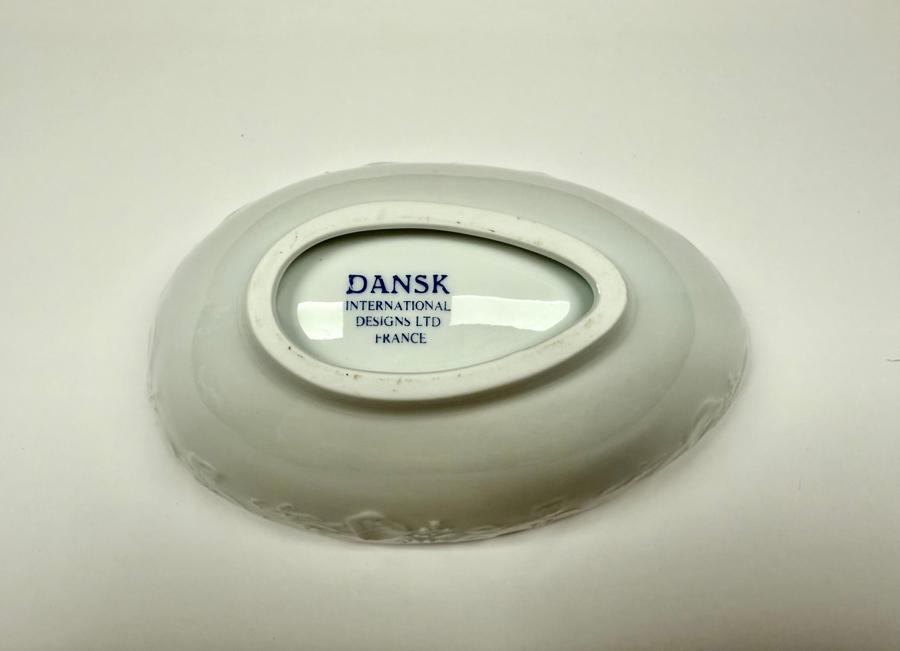 The Dansk "Ivy" white ceramic avocado bowl is made in France. It has an embossed ivy design and measures 6 inches long by 3 1/2 wide by 3 inches tall.