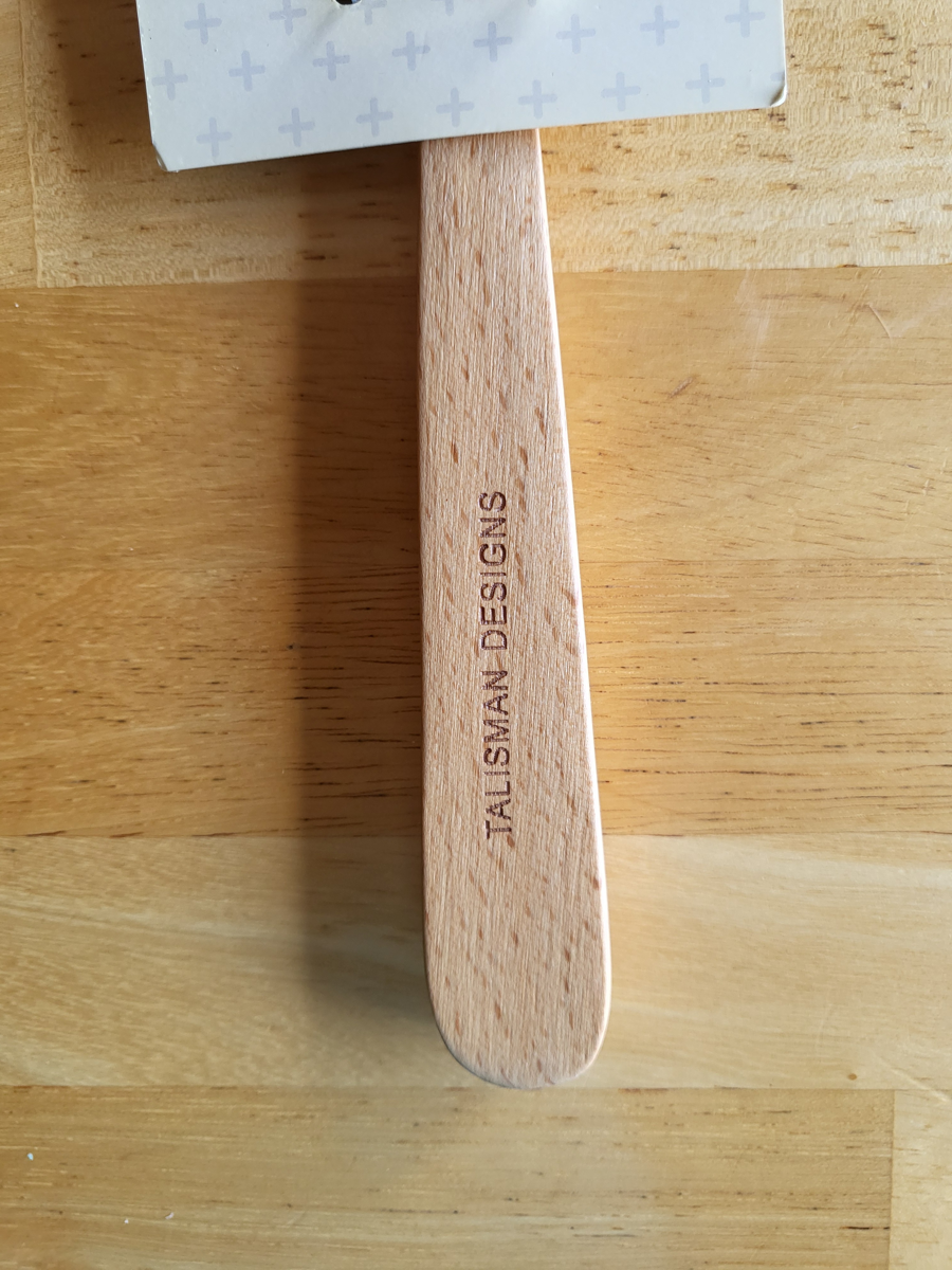 Cook in style with this solid beechwood etched spatula by Talisman Designs. Features a dapper cat with hat and bowtie, with a pawprint on the handle. Made from a responsibly managed forest, hand washing recommended. Measures about 12" x 2.5", in original packaging.