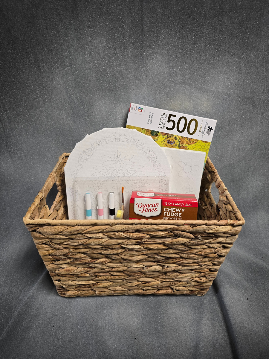 Are you looking for the perfect date night? This basket has the perfect activities for that. Items: *Brownie Mix *2 Canvas' *Paint *Van Gough Puzzle Basket Artist: Italia Mischke