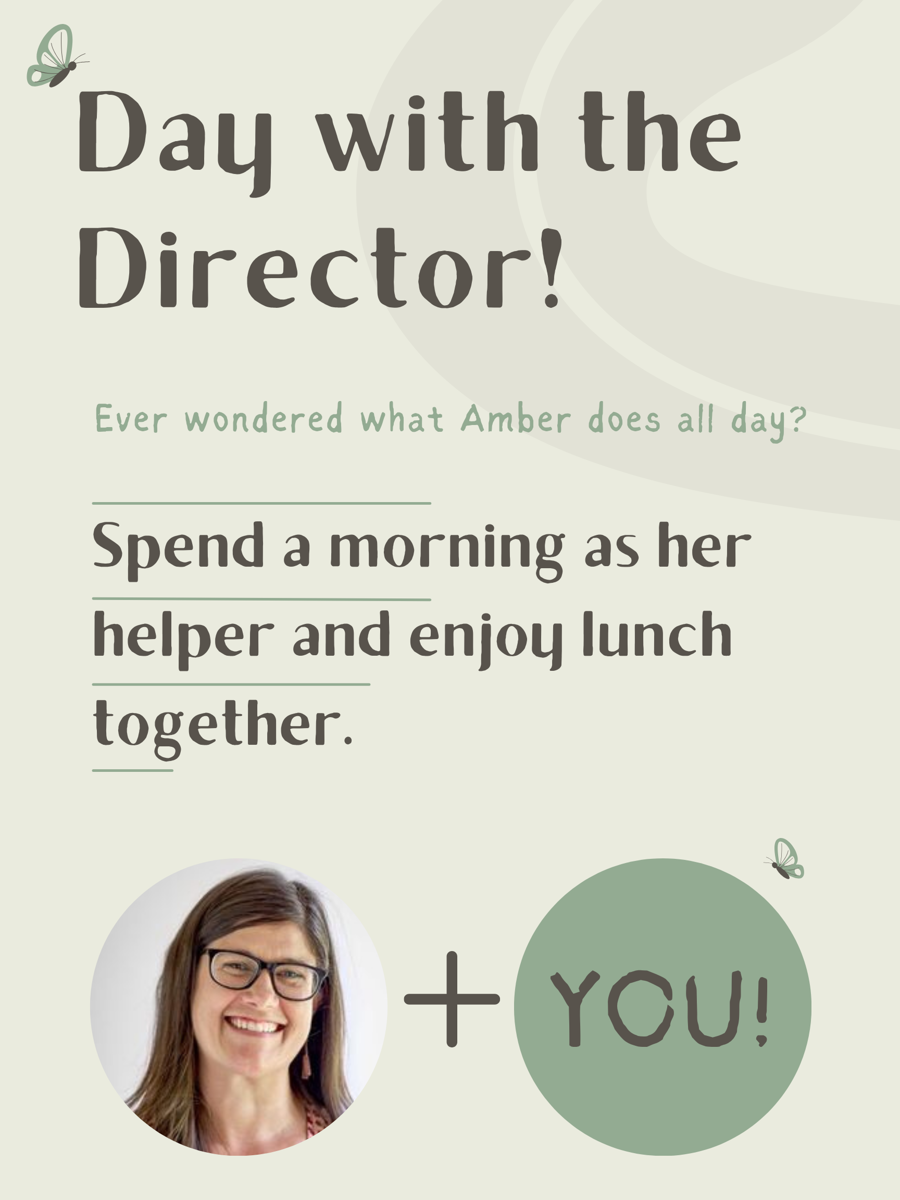 Ever wondered what Amber does all day? Interested in helping her out with the many things she has to accomplish? Spend the morning working alongside Amber as she moves through a day in the life of a director. You might be surprised at some of the things you will get to do! This experience is open to any student in ECC, LE, UE, or AC. The length of time and activities they participate in will be tailored to their developmental plane and classroom schedule. The end of their time together will culminate in lunch together. Your child can bring their own, or Amber will coordinate with the family and provide some of your child's favorite foods (within our lunch guidelines!)