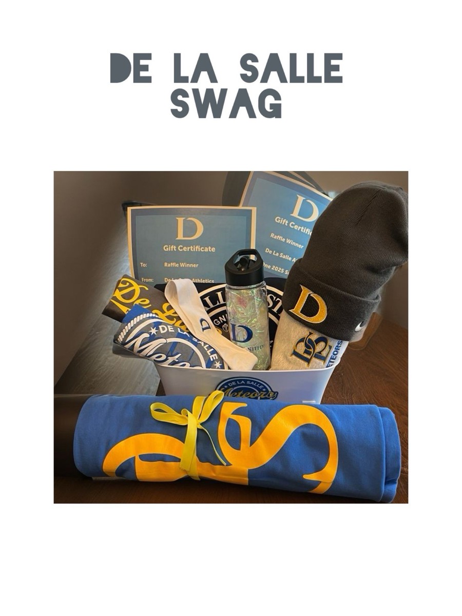 Get ready to show your De La Salle spirit with this incredible De La Salle Swag auction item! This exclusive package includes a variety of De La Salle Catholic High School merchandise that every fan or student will love. You will receive two gift certificates for Summer Athletic Camps, perfect for young athletes looking to improve their skills. Stay hydrated with a stylish water bottle and keep warm with a cozy blanket and a trendy stocking hat. Show off your school pride with multiple t-shirts and a fashionable headband, all featuring the iconic De La Salle Meteor Logo. Plus, there's a convenient bin to store all your De La Salle gear! Don't miss out on this fantastic opportunity to support De La Salle Catholic High School and gear up with some amazing swag!