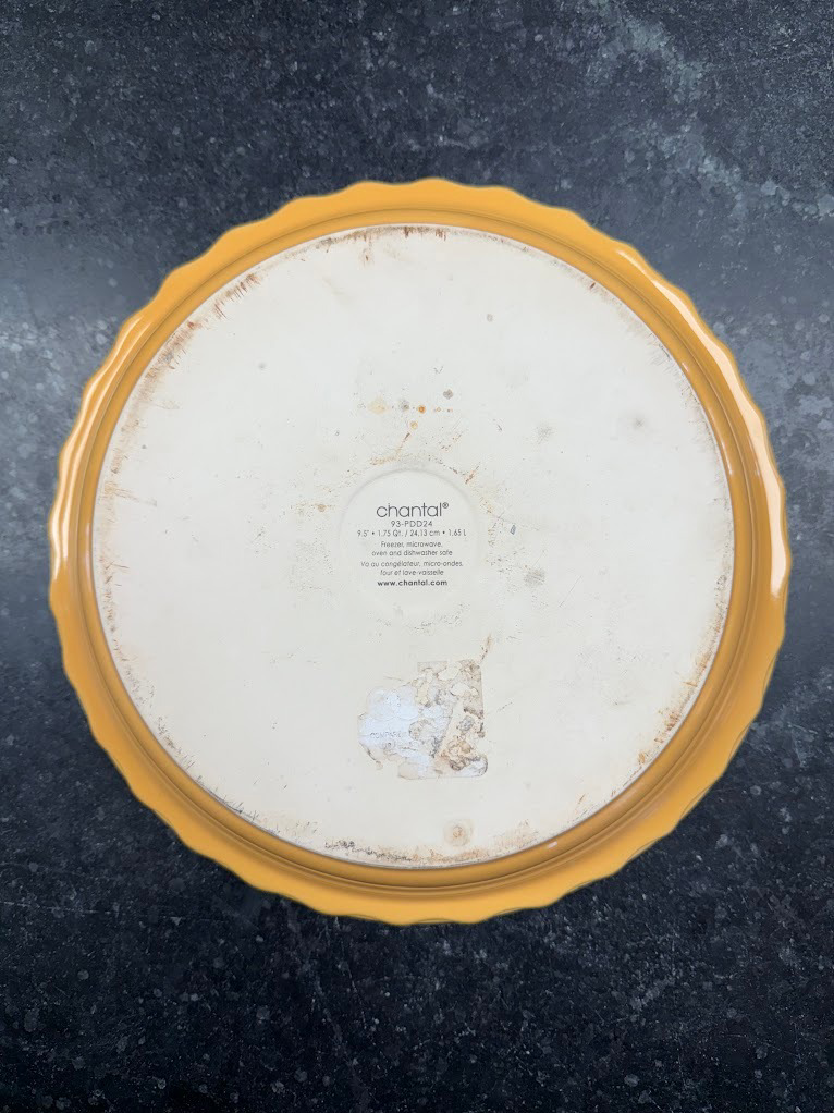 This generous deep dish pie pan comes from Chantal and is perfect for baking your favorite pies and casseroles. Marigold. 9.5 inches in diameter, 1.75 quarts.