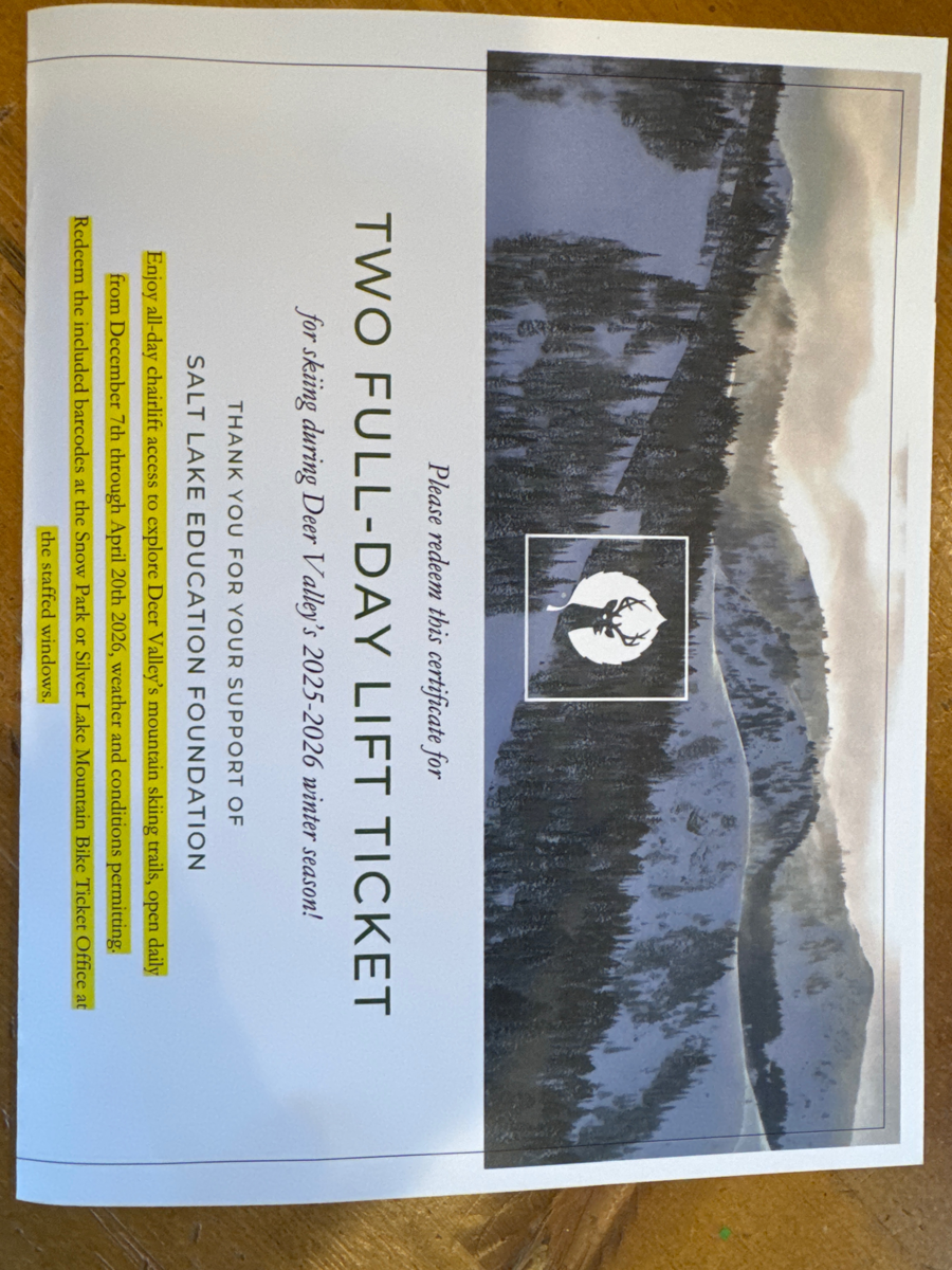 Thank you Deer Valley for donating Two Full Day Lift Tickets - 2025-26 season! Expires April 20, 2026!