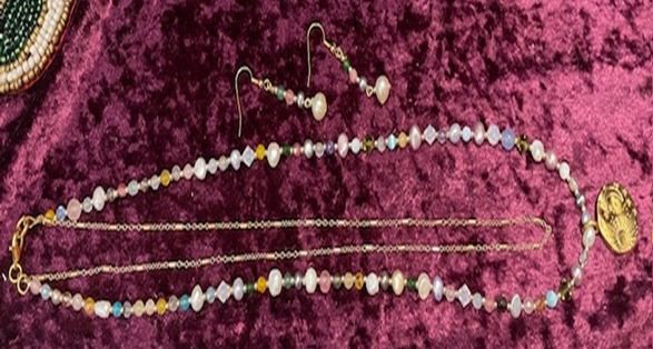 #1009 - Beautiful, delicate long necklace with "Anthropology- inspired" dupe, swarovski crystals, gold plated chain, pearls and gemstones with matching dangle earrings. Custom Necklace / NEW / Not redeemable for cash.