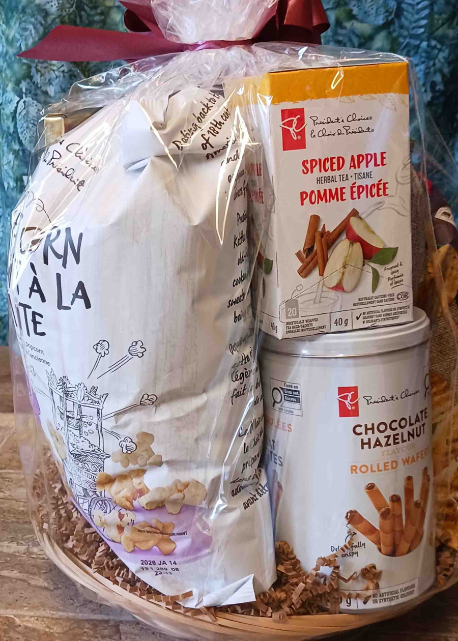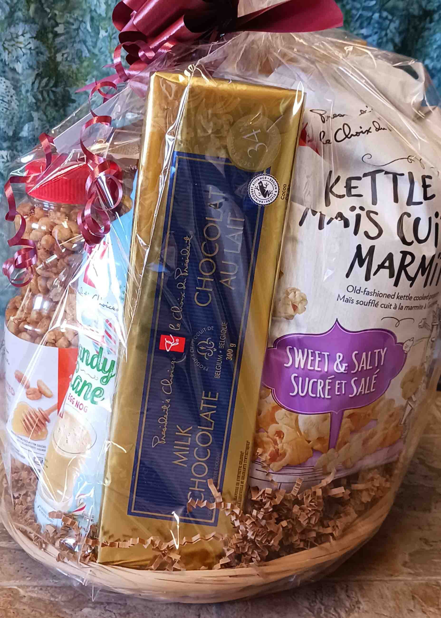 A generous gift basket loaded with delicious snacks and goodies. Perfect for holiday gift-giving.