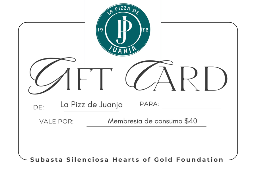 Treat yourself or gift the flavor of one of the best pizzas in the city! Bid on this Gift Card from La Pizza de Juanja, an establishment known for its quality and excellent atmosphere. Prize Details Prize: Consumption membership/credit valued at $40 (forty dollars). Use: The value can be used to cover the consumption of pizzas, beverages, or any other available product at the restaurant. Donated by: La Pizza de Juana Key Benefit This certificate is essentially a direct credit to enjoy a full meal at La Pizza de Juanja, perfect for a dinner date, a gathering with friends, or a delicious family night out. Español: ¡Date el gusto o regala el sabor de una de las mejores pizzas de la ciudad! Puja por esta Gift Card de La Pizza de Juanja, un establecimiento conocido por su calidad y excelente ambiente. Detalles del Premio Premio: Membresía de consumo con un valor de $40 (cuarenta dólares). Uso: El valor puede ser utilizado para cubrir el consumo de pizzas, bebidas, o cualquier otro producto disponible en el restaurante. Donado por: La Pizza de Juana Beneficio Clave Este certificado es esencialmente un crédito directo para disfrutar de una comida completa en La Pizza de Juanja, perfecto para una cena en pareja, una reunión de amigos, o una deliciosa noche familiar.