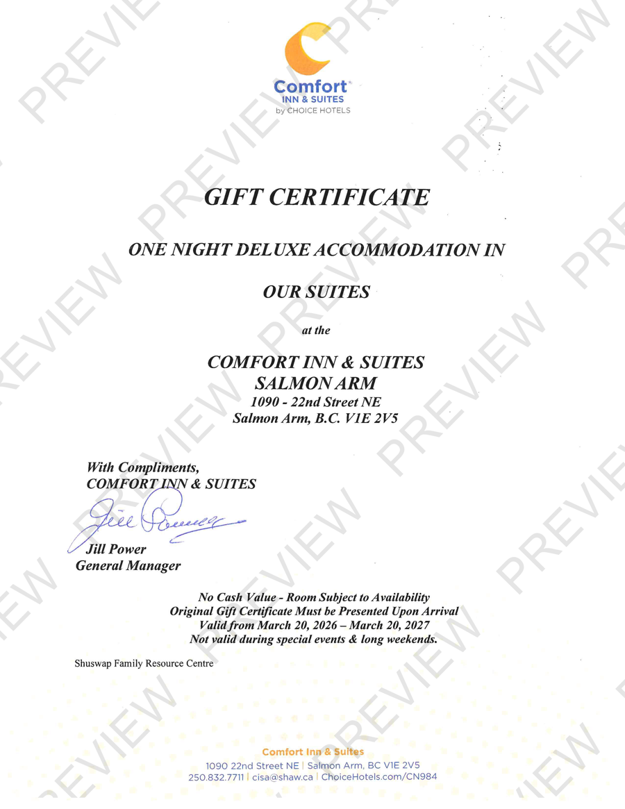 Payment and pick-up will take place at the Shuswap Family Centre only from March 23 to March 27 (items will not be shipped). We accept cash, e-transfer, debit, and credit card payments. Please be sure to know your winning item number(s). Centre hours are 9:00 am to 4:00 pm, Monday to Thursday. Address: 681 Marine Park Drive, Salmon Arm. Please know your winning Item ID#(s) when you pick up your item(s).