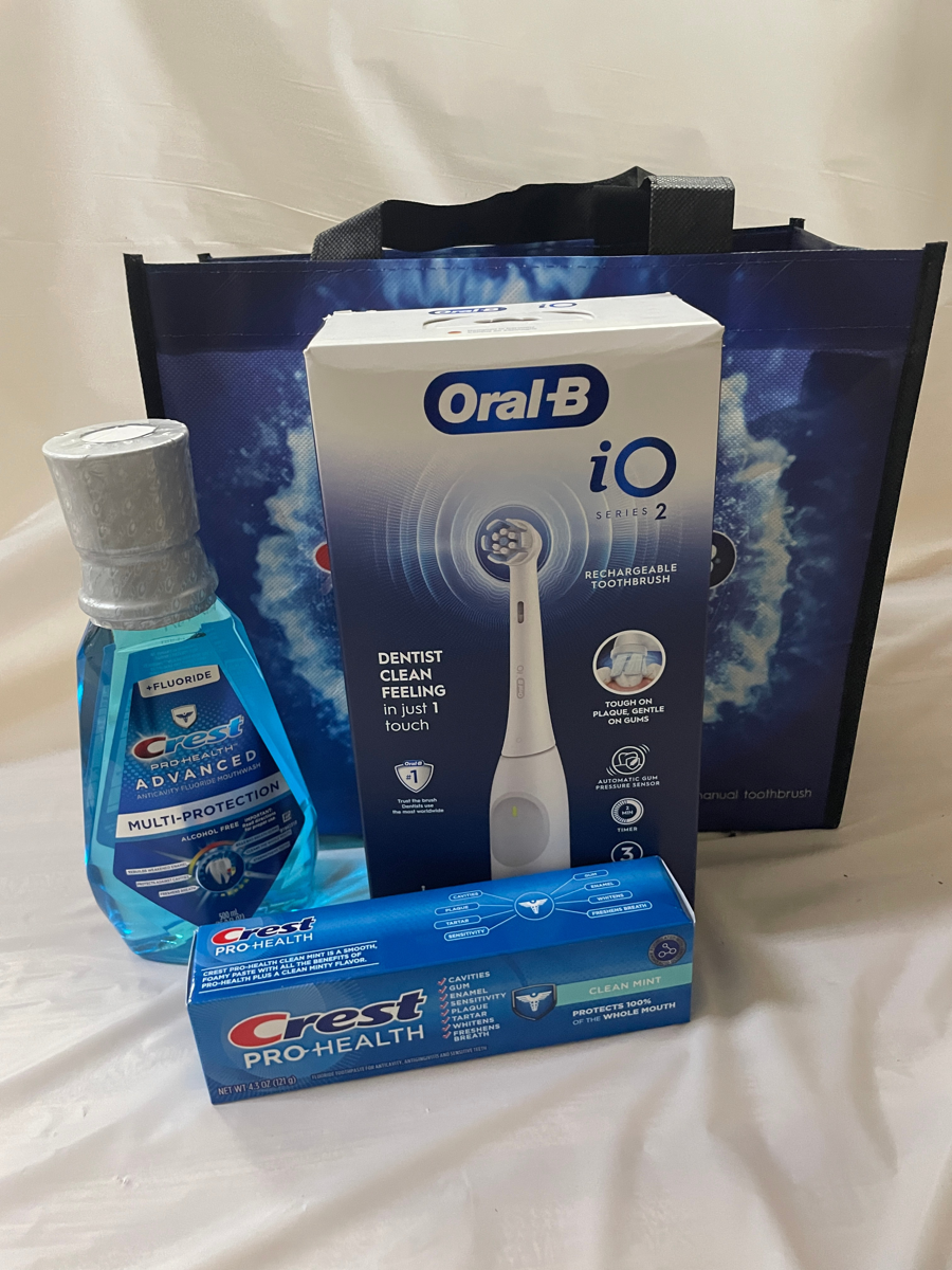 Includes: Oral B Electric toothbrush, Crest pro-health toothpaste, floss, and crest mouthwash