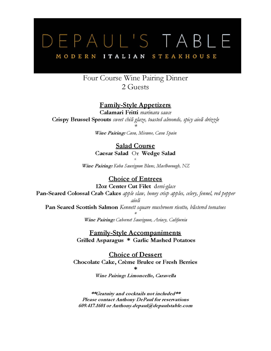 Indulge in an exquisite dining experience with DePaul's Table 4 Course Wine Pairing Dinner for 2. This exclusive meal features a meticulously crafted four-course menu, each dish expertly paired with a selection of fine wines to enhance the flavors of each serving. A generous gift donated by Anthony from DePaul's Table Modern Italian Steakhouse on Lancaster Avenue in Ardmore.