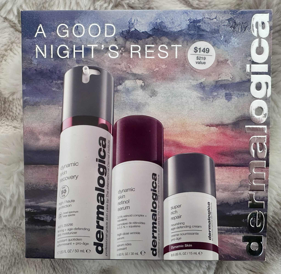 Give your skin the nighttime care it deserves with the Dermalogica A Good Night’s Rest set. This premium trio is designed to restore, hydrate, and renew your skin while you sleep, leaving you glowing by morning. Set Includes: Dynamic Skin Recovery – A nourishing moisturizer that supports skin firmness and moisture balance. Dynamic Skin Retinol Serum – A powerful, skin-smoothing retinol serum designed to refine texture and reduce visible signs of aging. Super Rich Repair Cream – An ultra-rich, deeply hydrating cream that strengthens and replenishes dry, stressed skin. Perfect for anyone wanting a rejuvenating nighttime routine, luxury skincare lovers, or gifting. Bid now and wake up to healthier, more radiant skin!