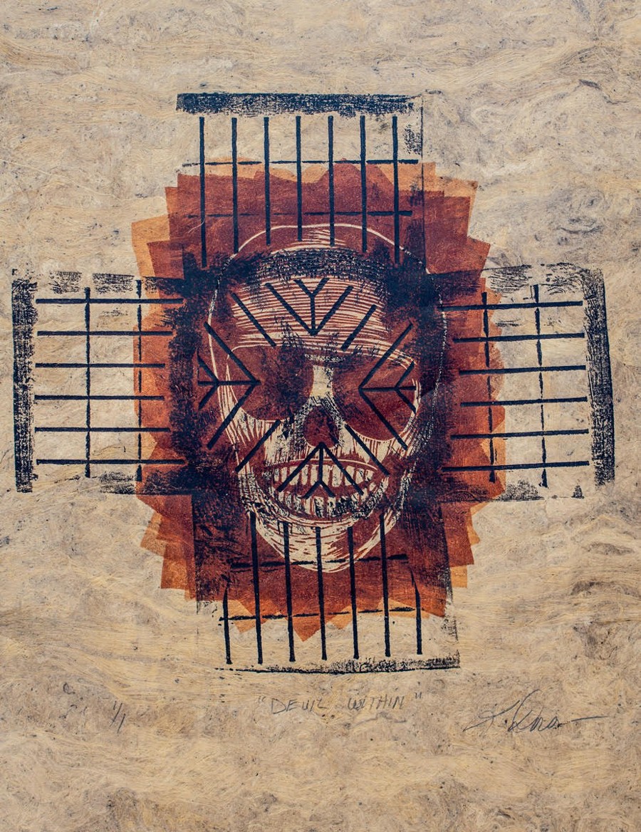 Original 1 of 1 framed collagraph with linocut over printed in specialty paper.