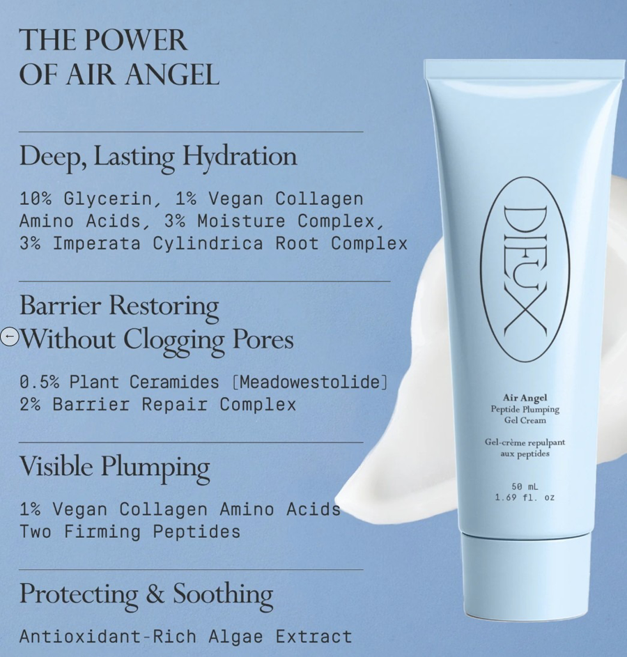Air Angel uses the power of peptides to visibly plump, hydrate, and smooth skin. Giving a cloud-like cocoon of breathable moisture, Air Angel is clinically shown to hydrate skin for up to 12 hours after application without clogging pores. Firming peptides and amino acids visibly plump and flood skin with hydration. Glycerin and our Moisture Complex work as humectants to draw in water and help skin retain moisture, keeping it quenched throughout the day.