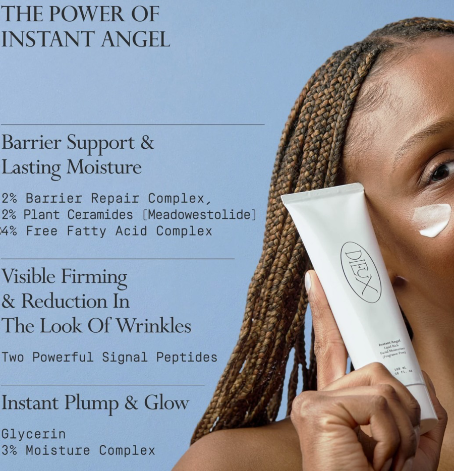 "Instant Angel is your skin barrier’s protector. Deeply moisturizing, this nourishing face cream supports skin while giving an ethereal glow. Using a blend of phytosterols, free fatty acids, palmitoyl hexapeptide-12, dipalmityl hydroxyproline, meadowestolide, ceramide NG, glycerin, urea, squalane and sodium PCA, Instant Angel gives lasting hydration while reinforcing the skin’s barrier leaving it feeling strong, smooth and firm. The result is an unfragranced, rich moisturizer that feels like silk without leaving the tell-tale residue of a richer cream.