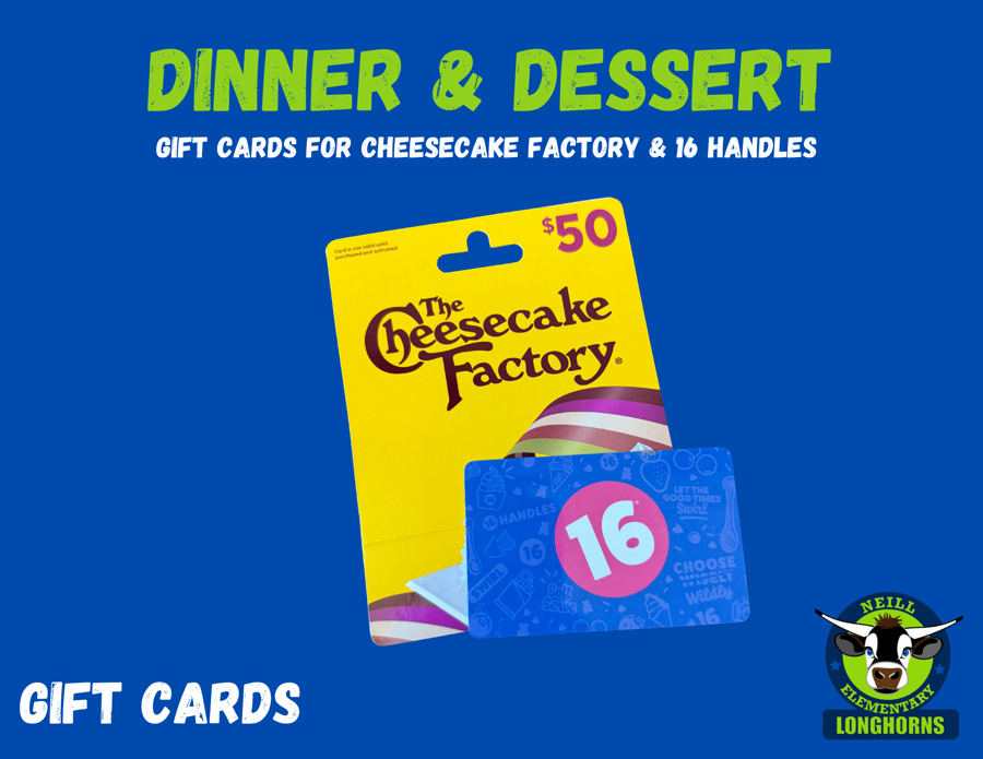 Enjoy a $50 gift card to The Cheesecake Factory and $10 gift card to 16 Handles