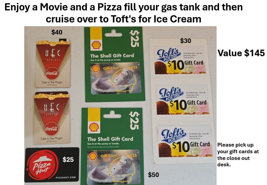Get ready for a fantastic fun filled evening out with this auction item. Gift Cards Galore! This amazing bundle includes a gift card for Pizza Hut, perfect for enjoying your favorite pizza with friends and family. Additionally, you’ll receive a gift card for a movie at UEC Theatres, allowing you to catch the latest blockbuster or enjoy a classic film on the big screen. To satisfy your sweet tooth, we have included a gift card for Tofts Ice Cream, where you can indulge in delicious, creamy treats. Lastly, there's a gas card to help you fill up your tank for all your adventures. Don’t miss out on this diverse selection of gift cards that cater to various tastes and experiences! Please pick up at the close out desk.
