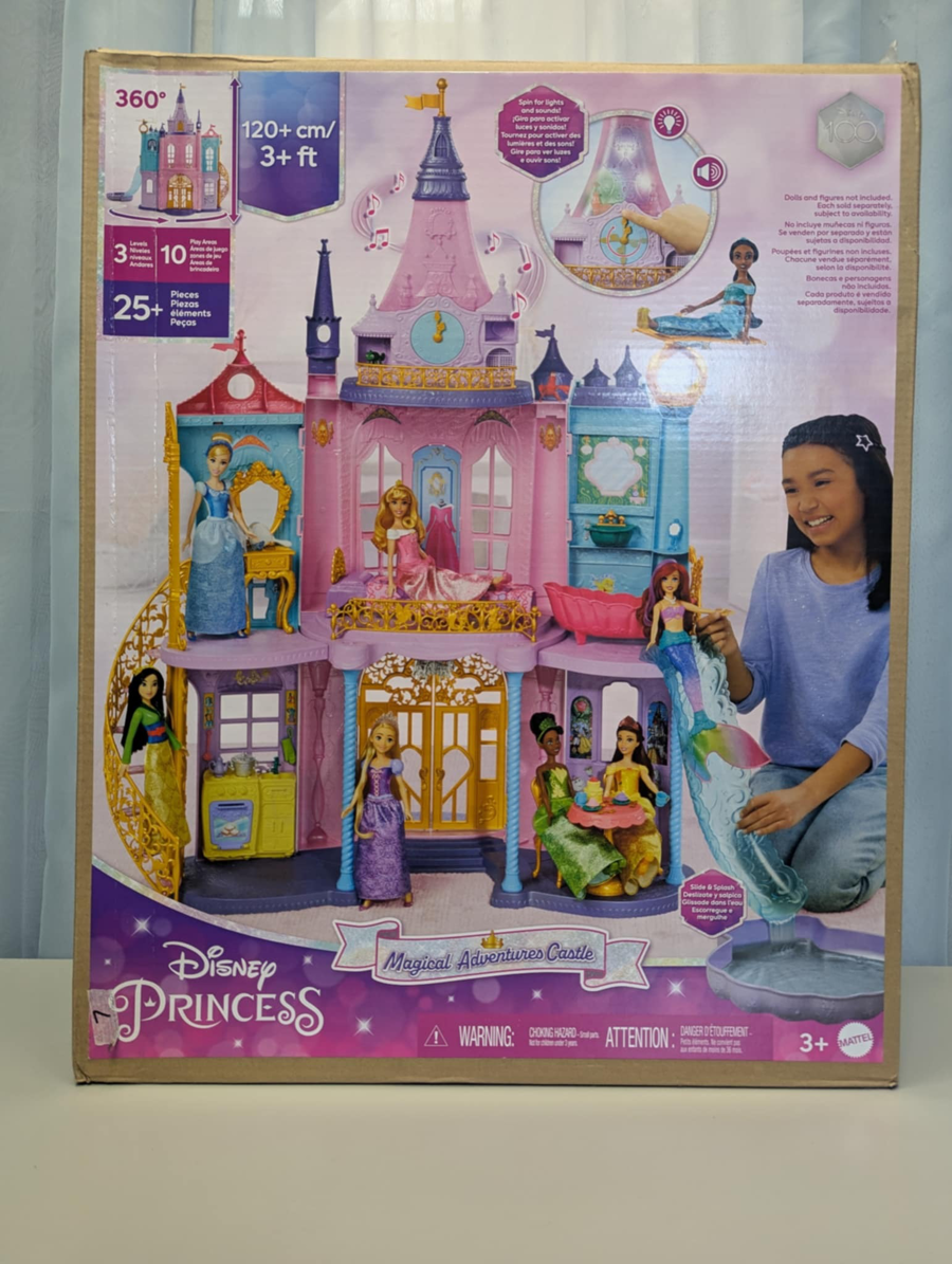 The amazing Magical Adventures Castle is the ultimate Disney Princess doll-house! Standing 4 feet tall and featuring 360 degree play and magical lights and sounds, the castle includes 10 play areas, each inspired by a Disney Princess character. Kids will delight in finding 3 levels of play, a slide and pool, and 25+ furniture and accessories. It's the perfect home for kids' Disney Princess dolls and adventures! Colors and decorations may vary. -Inspired by unforgettable characters and scenes in Disney movies, this Magical Adventures Castle is a dream come true for any Disney Princess fan! -Standing at 4 feet tall, the castle includes 10 play areas, each themed to a different Disney Princess character. -Kids can spin the clock hands to activate magical lights and sounds, including a fireworks show! -Features a slide, pool, and spinning magic carpet for adventures in and out of the water. Also includes a staircase and balcony for even more storytelling play! -Castle doll-house includes 28 furniture and accessory pieces, including a table and chairs, bath tub, bed and blanket, and kitchen play pieces that can be plugged into the table and stovetop. Batteries Included: No Batteries Required: Yes Batteries: 3 AA (LR6) Alkaline