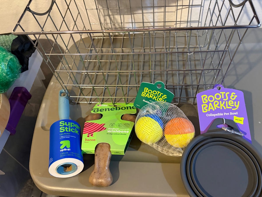 Metal Bin with Dog items (medium mat, collapsible bowl, Benebone bacon flavored, set of two balls, lint roller)