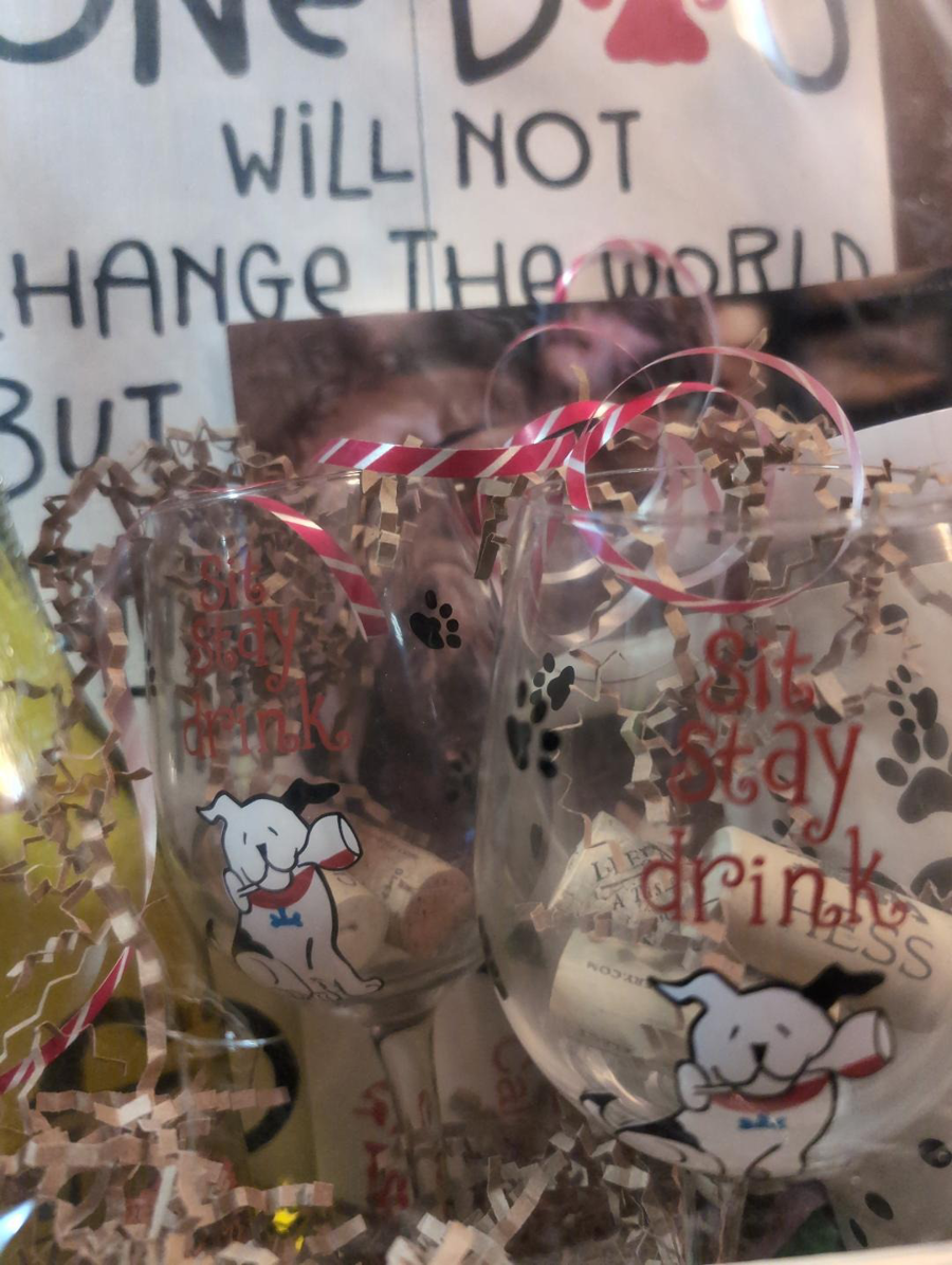 Includes a Bottle LOVE mango PLATINO Wine, 2 dog themed wine glasses, A Dog Mom Insulated Large Cup, ASPCA Wall Calendar, a reusable Wooden Box, and a Large Dog Sign Saving One Dog Will Not Change the World,.....but surely for that one dog-the whole world changed forever! Awesome basket for the Dog Lovers out there!
