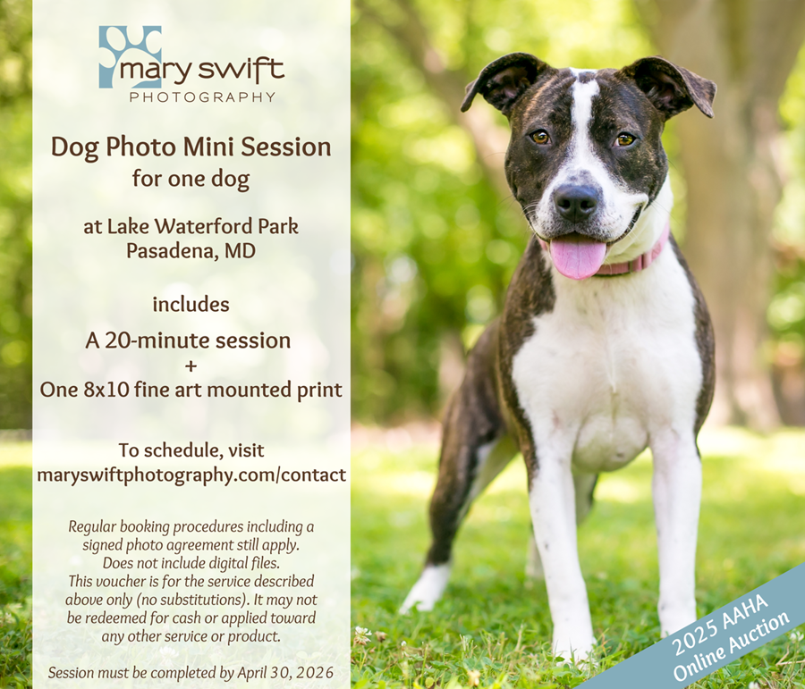 Celebrate your furry friend with a 20-minute dog photography mini-session from Mary Swift Photography — a professional pet photographer who beautifully captures the personality and spirit of every pup! This session includes a stunning 8x10-inch fine art mounted print to treasure forever. A huge thank you to Mary Swift Photography for this generous donation and for supporting AAHA Rescue!