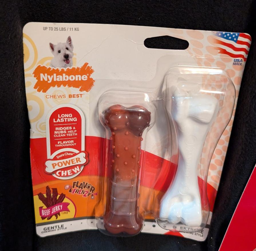 Includes: Nylabone Chews, Kong Wubbaa, small rope ball, 3 assorted stuffed toys, a holiday neck scrunchy, and a holiday head band /ANTLERS! WOOF woof WOOF woof