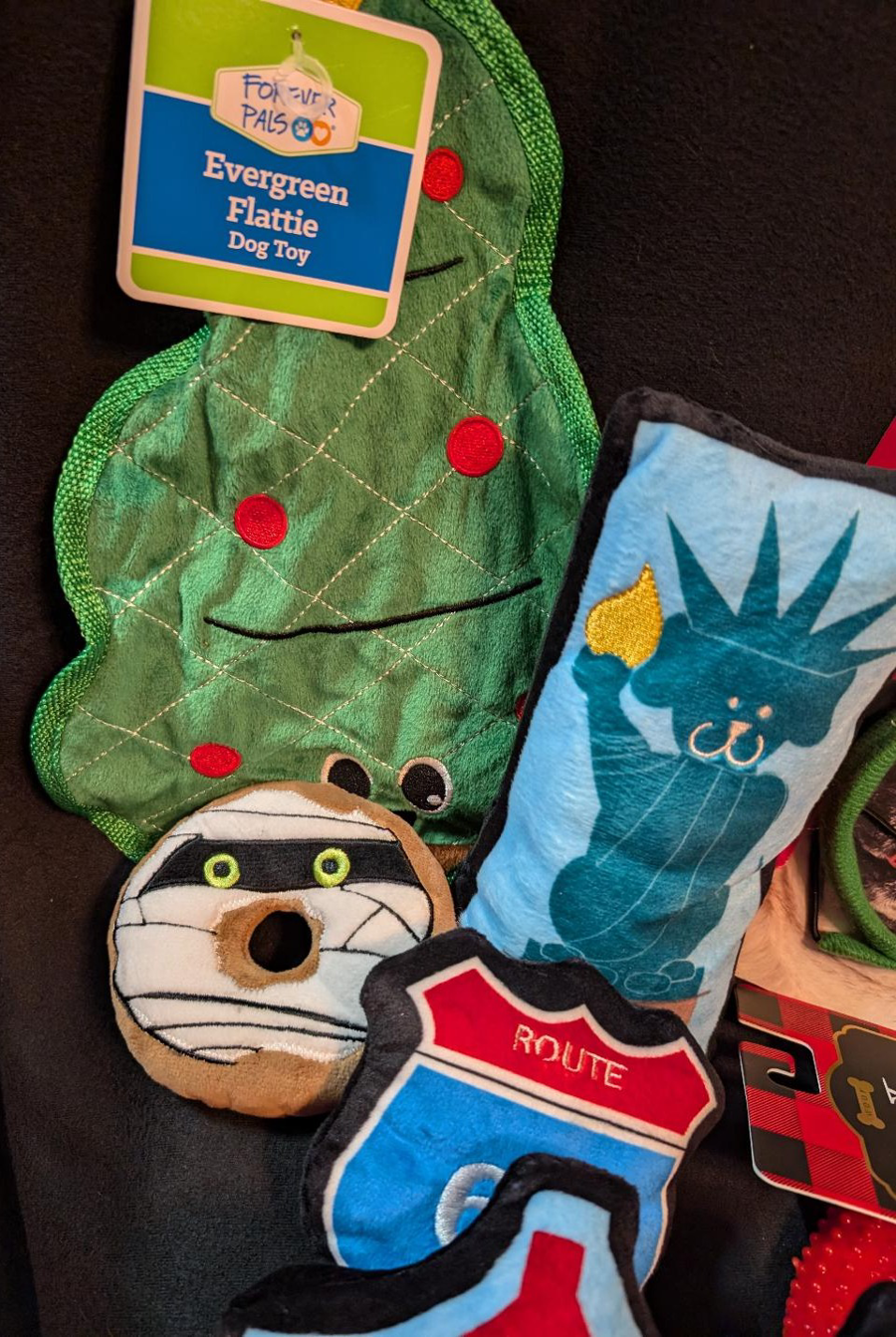 This gift bag comes complete with A holiday rope toy, a no-stuffing crinkle holiday tree, a round mummy donut toy, 3 Americana stuffed toys, and a holiday head band! Comes in a gift bag ready for Santa to put under the Christmas tree!