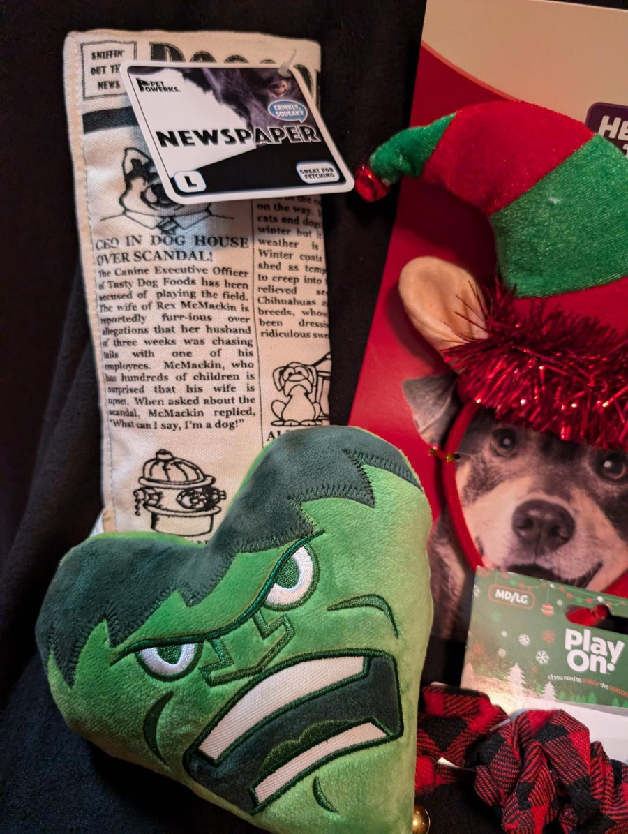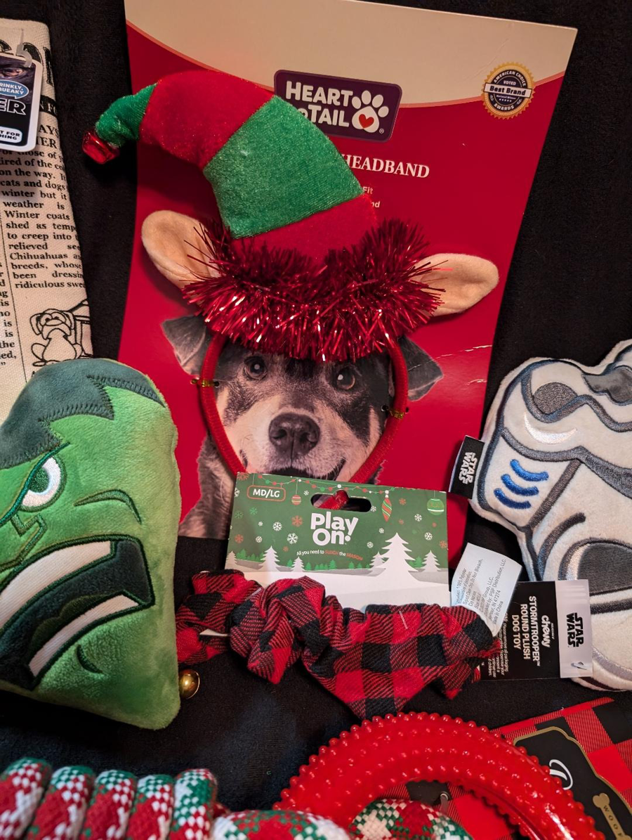 Includes a non-stuffing crinkle squeaker newspaper, a holiday rope toy, a plaid holiday neck scrunchy, 2 stuffed toys, and a holiday headband for those special photo-ops. All ready to place under the tree...woof WOOF woof!