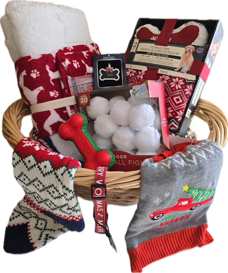 Get ready to pamper your furry friend this holiday season with our delightful Dogs Christmas Basket! This festive basket is packed with everything your dog will need to celebrate Christmas in style. Inside, you'll find a cozy dog blanket and pillow set that will keep your pet warm and comfortable during the chilly winter nights. We've also included a stylish dog collar to ensure your pup looks their best for all the holiday gatherings. To make Christmas even more special, this basket comes with a festive stocking filled with toys and treats that your dog will absolutely love. To top it all off, we've added a cute pet sweater to keep your dog snug and fashionable during the holiday festivities. Treat your beloved canine companion to this wonderful Dogs Christmas Basket and make this Christmas unforgettable!