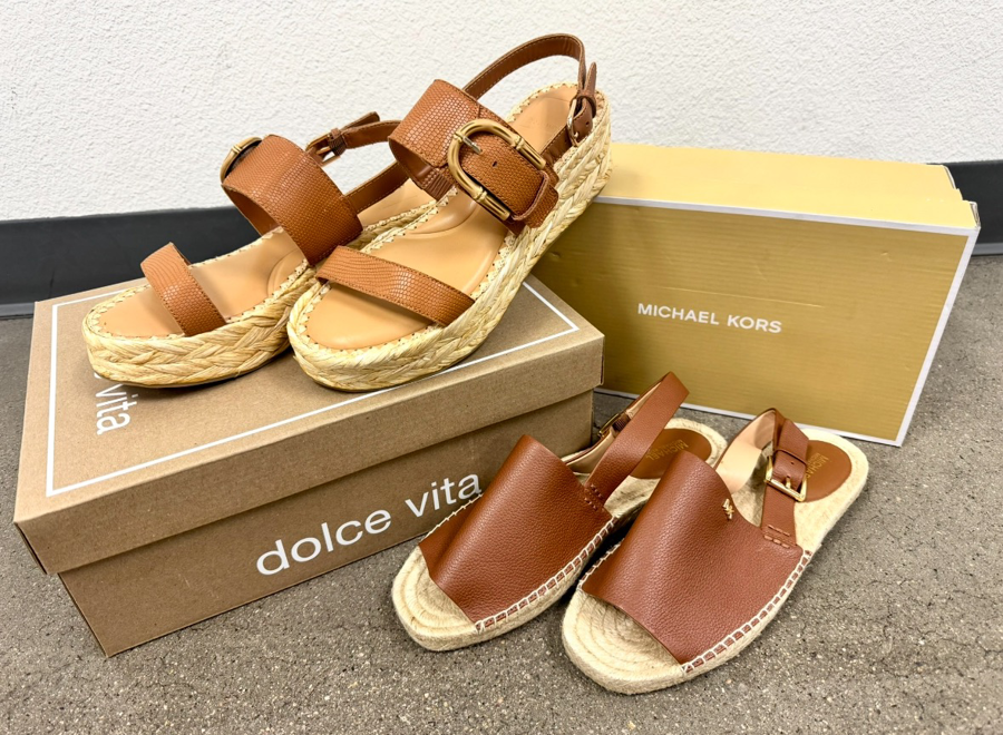 "Dolce Vita Women's Brown Leather Sandal (Size 8.5). Elevate your footwear collection with these stylish Dolce Vita women's sandals in a rich brown leather. Size 8.5, designed for comfort and fashion, these sandals will add a touch of sophistication to any outfit. Perfect for warm weather, they combine modern style with timeless appeal. Don't miss out on these versatile and chic sandals! Michael Kors Women's Brown Leather Sandal (Size 8.5) Step out in style with these luxurious Michael Kors women's sandals in a sleek brown leather. Size 8.5, these sandals offer both comfort and elegance, with the iconic Michael Kors design. A must-have for any wardrobe, they’re perfect for casual or dressier occasions. Add a touch of high-end fashion to your summer look with these gorgeous sandals!